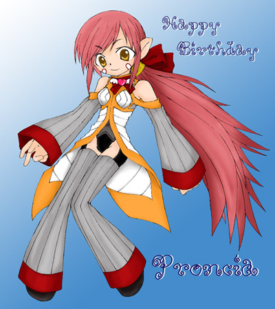 きらる君から誕生日プレゼントでもらいました!勇者プロンシアです!嬉しすぎる、まさか勇者が描かれるなんて、影薄いのに!てかプレートパンツってエロいな!(ぉ 武装ははずしてるみたいなので一時の平和を楽しんでいるような感じでしょうか。ありがとー!縮小版もありますよ→■